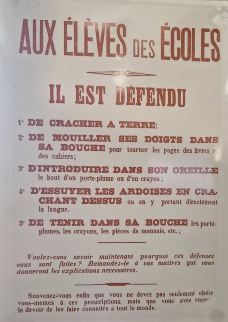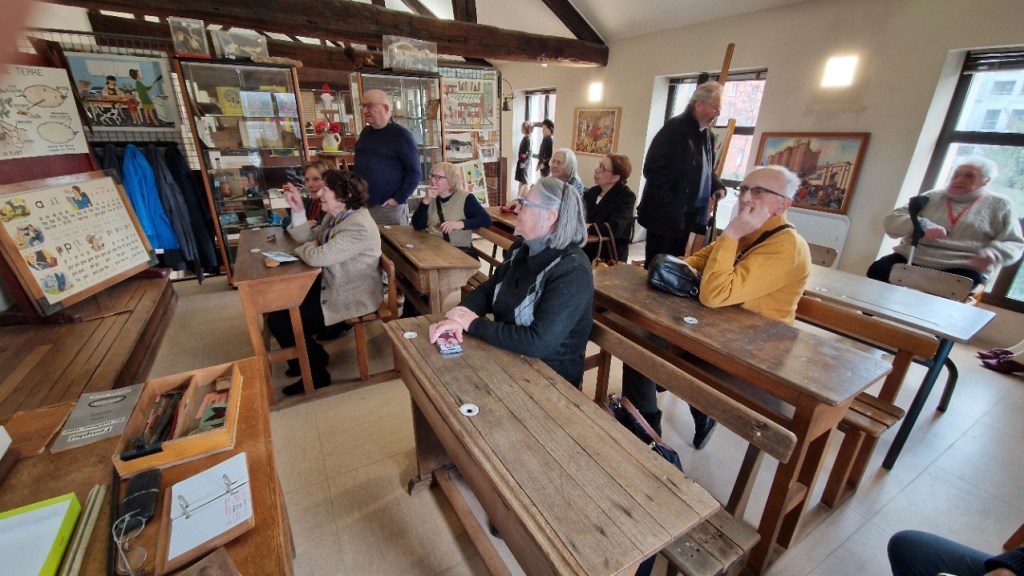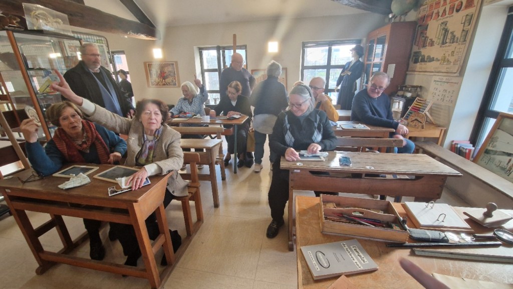 Accompagné de ses camarades gestionnaires du musée qui nous attendaient tous, et après nous avoir expliqué l’histoire de l’écriture depuis le cunéiforme, depuis les tablettes d’argile, le papyrus, le parchemin et enfin le papier, il nous a guidés de main de maître, nous faisant remarquer les objets les plus rares ou les plus évocateurs de nos jeunes années d’écoliers. Ensuite, nous sommes assis sur des bancs d’écoliers (qui nous ont clairement fait comprendre que nous avions grandi), nous avons écrit notre dictée à la craie sur une ardoise…
