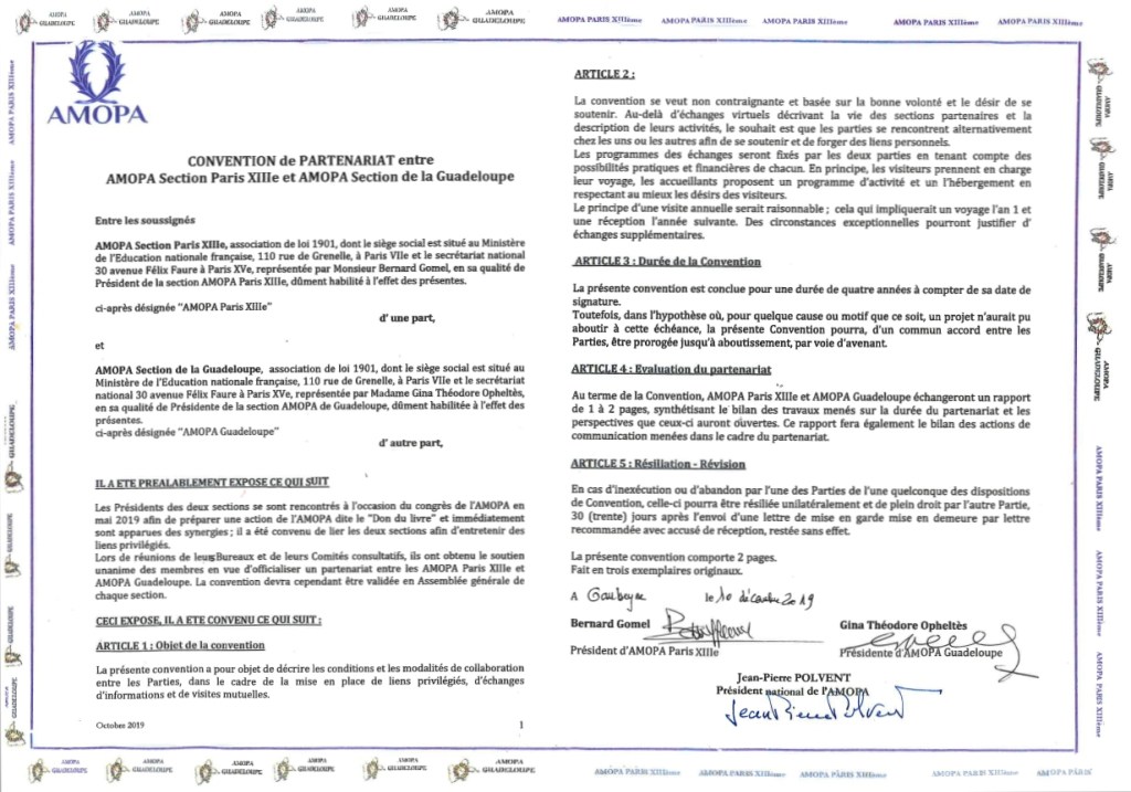 Très vite, nous avons décidé d’une visite et nos amis ont accueilli une délégation de membres du Bureau dans leur île paradisiaque : Le récit de ce voyage a fait l’objet d’une publication sur le site national d’où un lien lui est dédié https://wordpress.com/page/sectionamopaparis13e.org/3406 à cette occasion, une convention a été signée.