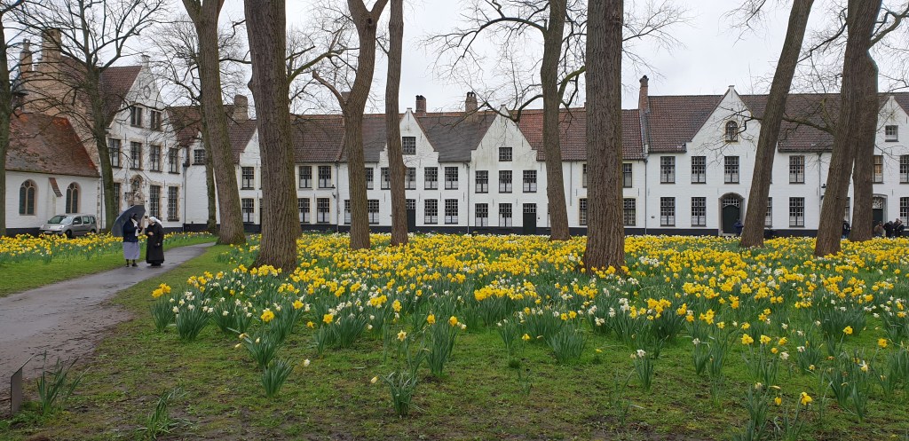 Le lendemain fut consacré à la visite de Bruges, nous commençâmes par le Béguinage, illuminé de Jonquilles et de Narcisses. Nous y rencontrâmes et échangeâmes avec quelques sœurs âgées en retraite dans cet endroit préservé.