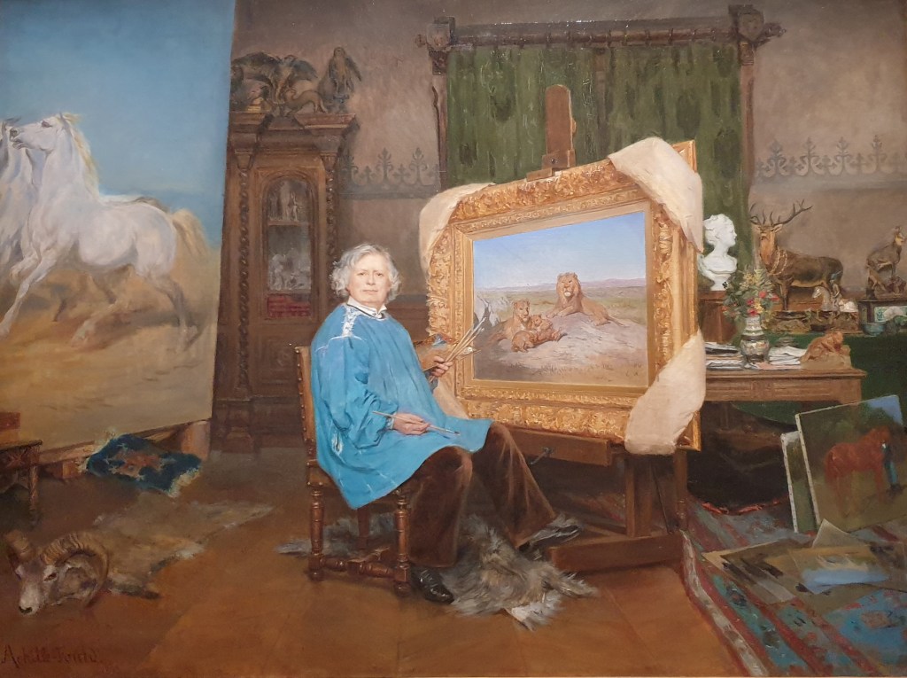 Au milieu, Rosa Bonheur dans son atelier du château de By (Fontainebleau) peinte par Georges Achille Fould