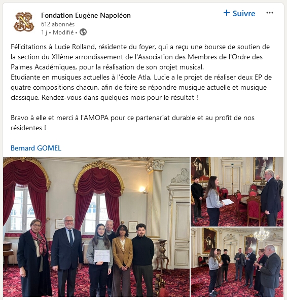 Un chèque de 500€ a été remis à Mademoiselle Lucie Rolland au cours d’une petite cérémonie, intime et conviviale ce dernier jeudi 5 décembre, à la Fondation Eugène Napoléon dont elle est pensionnaire, en présence de Monsieur François-Xavier Moreau, délégué général, de Bernard Gomel, administrateur national et président de la section Paris XII-XIII, accompagné de Madame Rose-Marie Wilbert, secrétaire de la section et de Monsieur Didier Brunet, membre du comité consultatif. Madame Jacqueline Chaussade, Vice-présidente, empêchée était excusée.