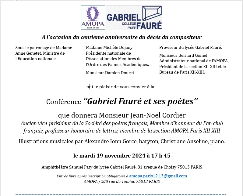 » Nous avons beaucoup apprécié la conférence de Jean-Noël Cordier sur « Fauré et ses poètes » de mardi dernier, organisée par votre section : non seulement le conférencier connaissait remarquablement son sujet et nous a fait découvrir le genre français de la « mélodie », mais l’accompagnement musical (piano et baryton) était une idée géniale, qui complétait à merveille les propos du conférencier. «