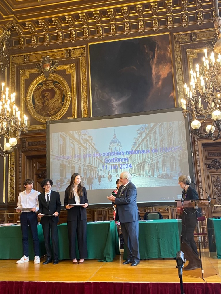 Ils ont été invités avec leurs professeures à deux cérémonies de remise, la première en juin où l’AMOPA les a invités dans les grands salons de la Sorbonne, sous le haut patronage du général d’armée François Lecointre, Grand Chancelier de la Légion d’Honneur et de la Présidente de l’AMOPA, Madame Michèle Dujany.