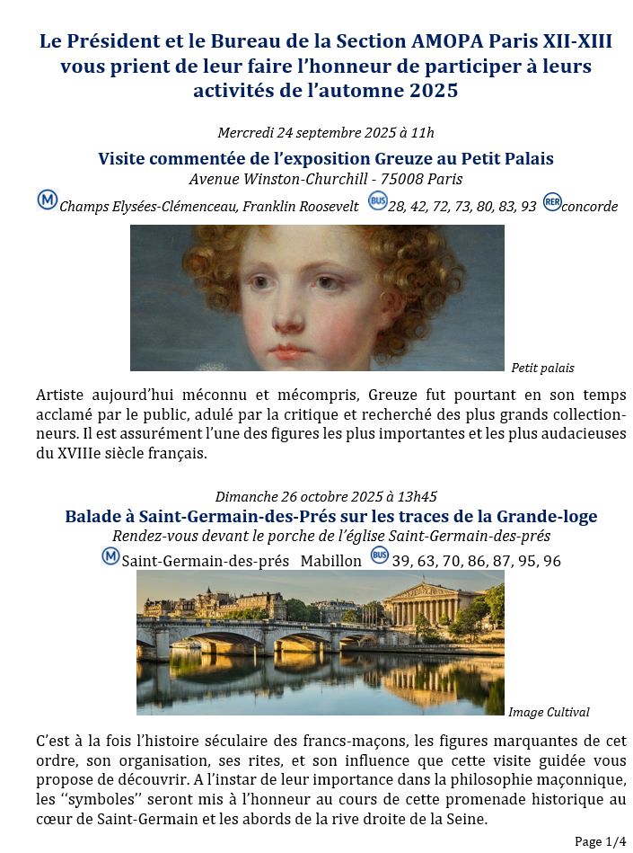 Le Président et le Bureau de la Section AMOPA Paris XII-XIII vous prient de leur faire l’honneur de participer à leurs activités de l’automne et de l’hiver 2025/2026