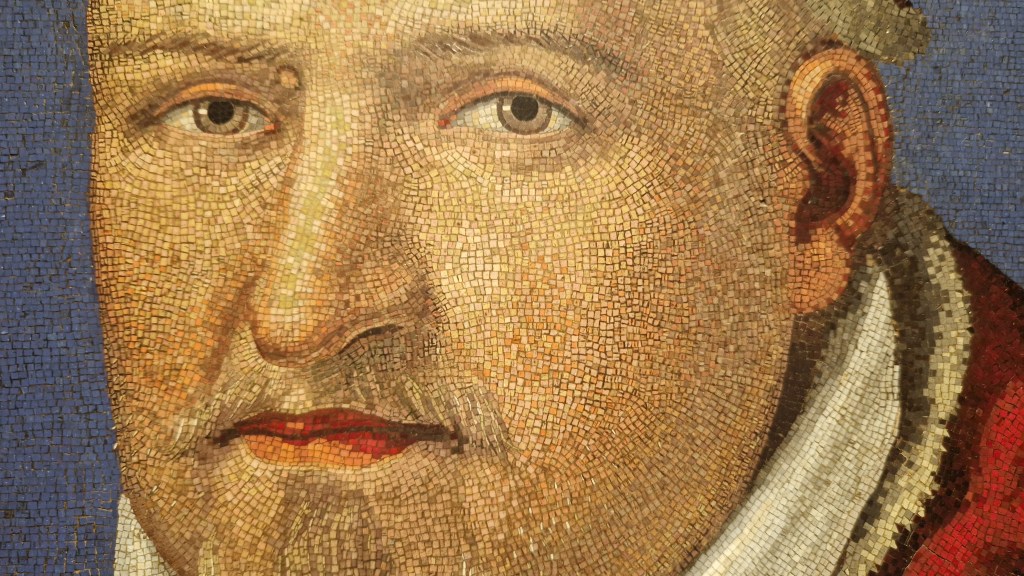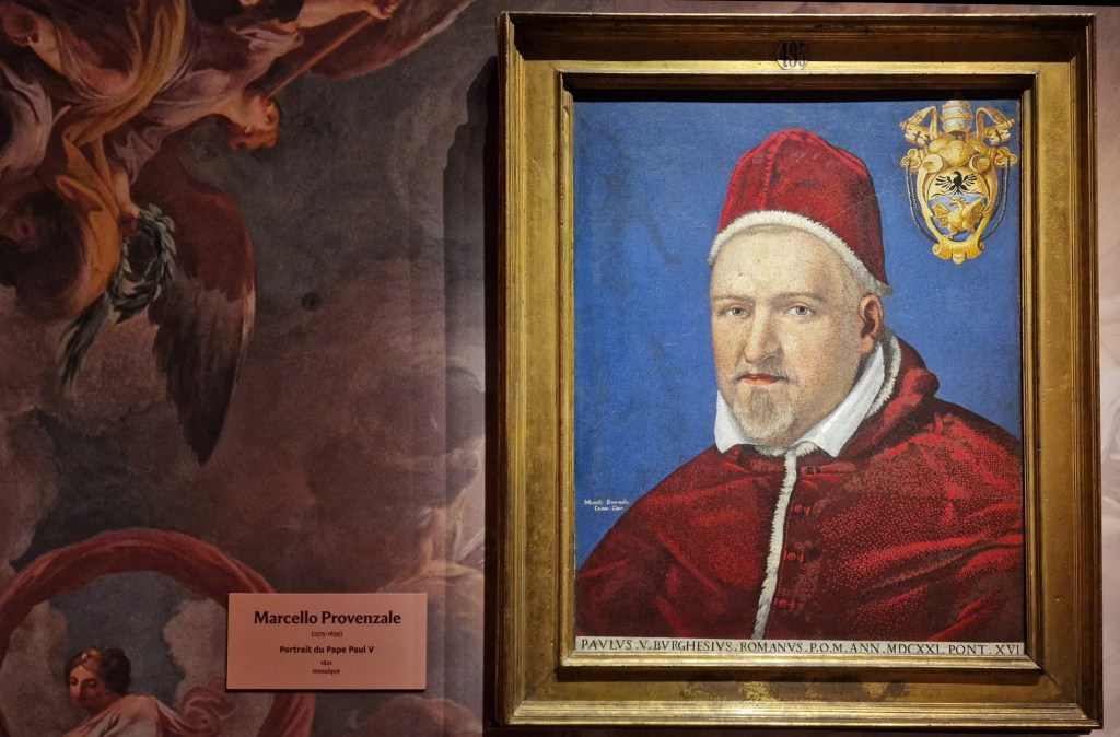 Ici une peinture de Marcello Provenzale utilisant une technique en mosaïque peintes représentant le Pape Paul V Borghèse.