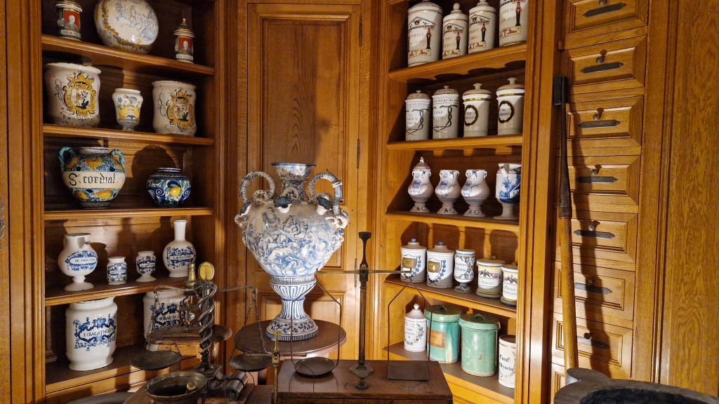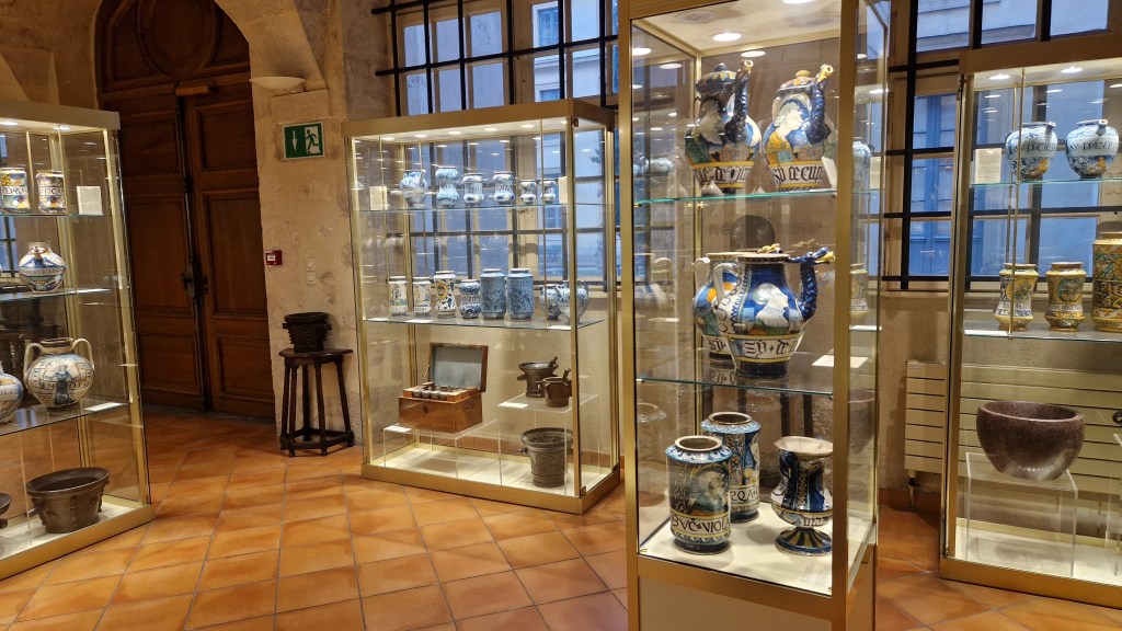 Avant de quitter le musée, nous avions libre accès à la collection de pots à pharmacie des docteurs Debat, beaucoup viennent d’Italie, quelques uns d’Espagne et plus rarement d’Allemagne et de France.